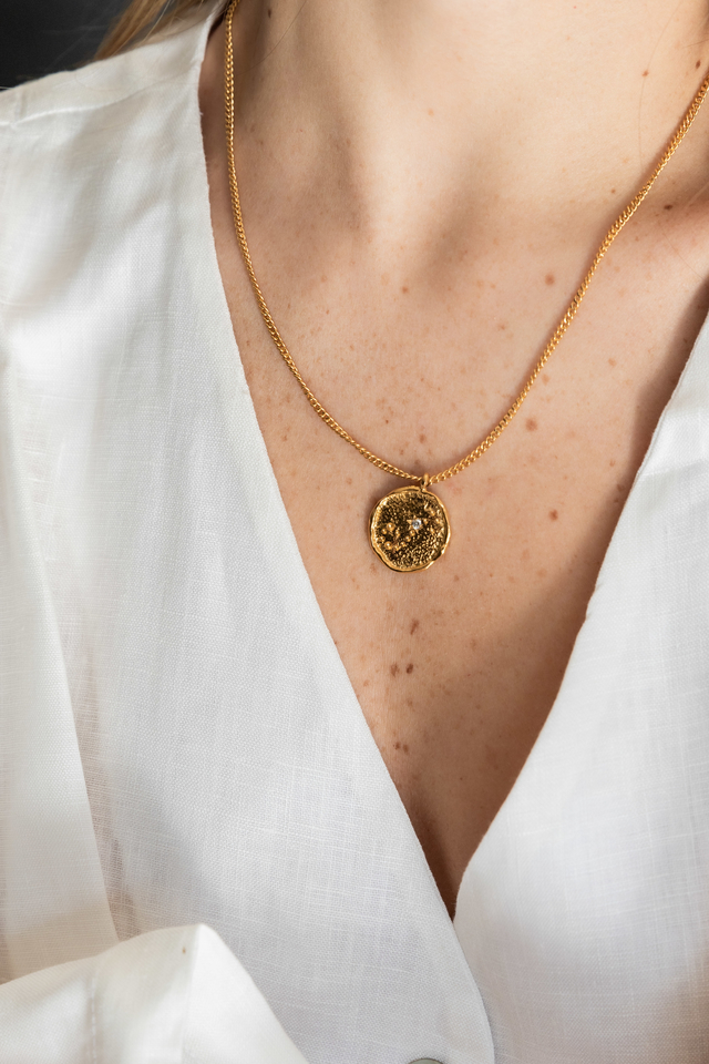 Zodiac, hecha de bronce enchapada en oro, lleva al frente la constelación de tu signo zodiacal en forma de puntos tallada a mano junto con un cubic engarzado. Al dorso, se encuentra la afirmación que le corresponde a tu signo, que refleja la cualidad principal del mismo y es el motor que, bien aplicado, nos ayuda a lograr las metas en la vida. Usala del lado que más te guste y llevala siempre cerca para recordar tu lema cada vez que lo necesites. Podes elegir entre el brillo clásico (blanco) o el del color de tu signo (marrón). Incluye cadena de bronce enchapada en oro.